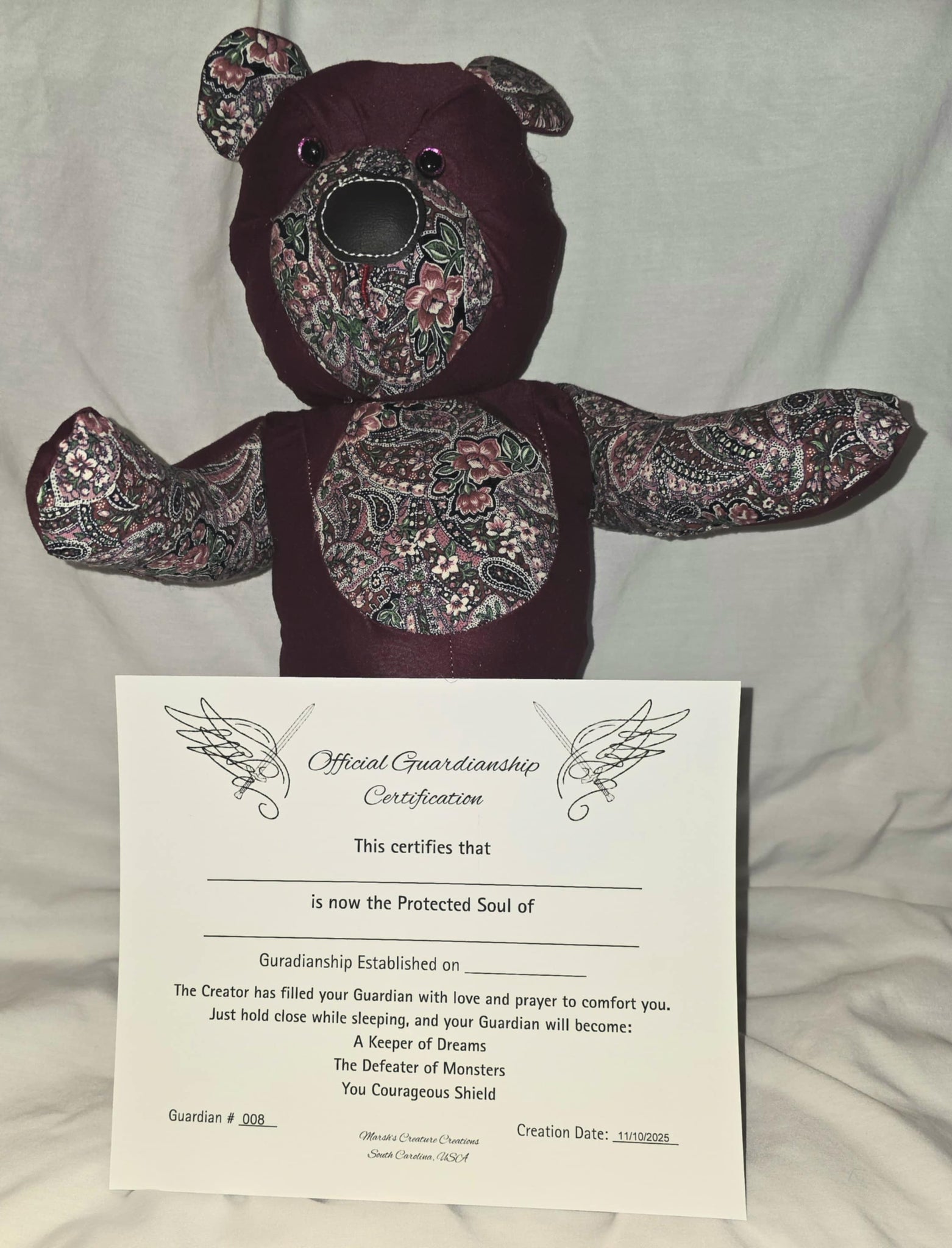 I was made for you with love and devotion. Inside me is a protection prayer – based upon Deuteronomy 33:12. To further my purpose my creator recited the prayer as she sewed me, instilling God’s peace and love within my stuffing.
